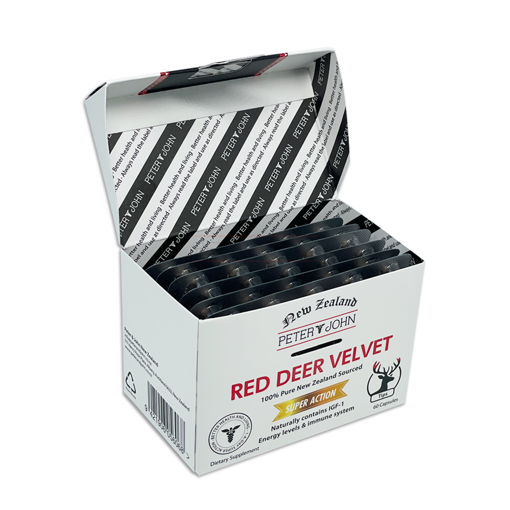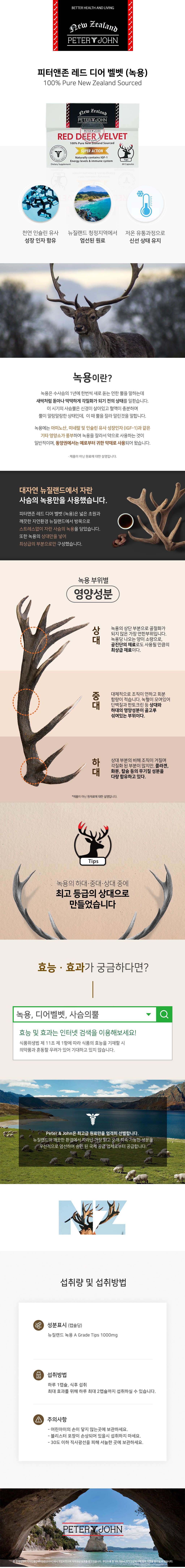 퓨어 뉴질랜드 녹용 원료 성분 업그레이드! A Grade Tips 블리스터 포장으로 위생적이고 신선함을 유지 피터앤존 레드 디어 벨벳 Red Deer Velvet 60capsules 녹용이란? 녹용은 수사슴의 1년에 한번씩 새로 돋는 연한 뿔을 말하는데 새싹처럼 돋아나 딱딱하게 각질화가 되기 전의 상태를 일컫습니다. 이 시기의 사슴뿔은 신경이 살아있고 혈액이 충분하며 뿔이 말랑말랑한 상태인데, 이때 뿔을 잘라 말린것을 말합니다. 녹용에는 아미노산, 미네랄 및 인슐린 유사 성장인자(IGF-1)과 같은 기타 영양소가 풍부하여 녹용을 잘