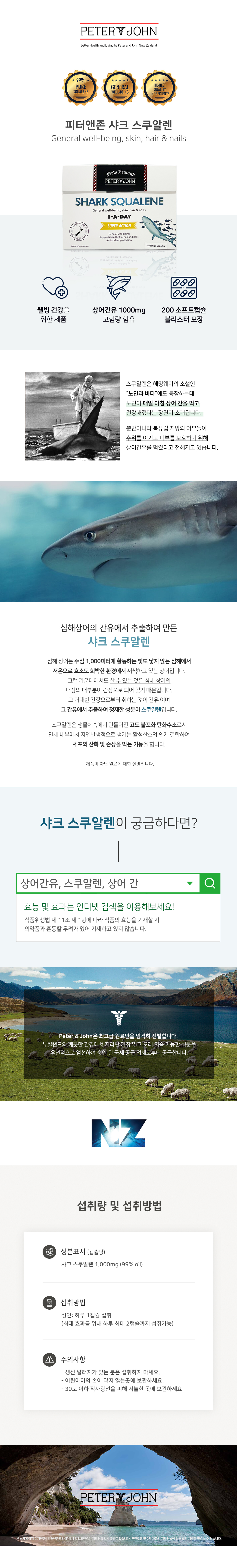 상어간유 1000mg 함유 고도 불포화 탄화수소 부드럽고 흡수가 좋은 소프트젤 캡슐 피터앤존 샤크 스쿠알렌 Shark Squalene 180 softgel capsules 심해상어의 간유에서 추출하여 만든 샤크 스쿠알렌 심해상어는 수심 1,000미터에 활동하는 빛도 닿지 않는 심해에서 저온으로 효소도 희박한 환경에서 서식하고 있는 상어입니다. 그런 가운데에서도 살 수 있는 것은 심해상어의 내장의 대부분이 간장으로 되어 있기 때문입니다. 그 거대한 간장으로부터 취하는 것이 간유이며 그 간유에서 추출하여 정제한 성분이 스쿠알렌입니다.