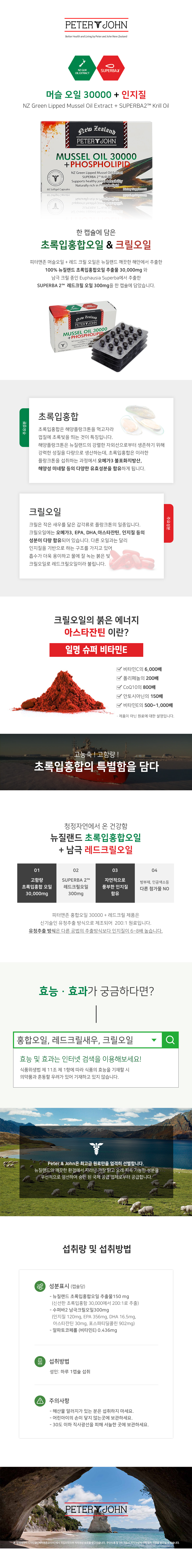 최적의 성분 조합 고함량 초록입홍합 30,000mg에 홍합오일의 빠른 흡수를 돕는 남극 레드크릴까지! (60캡슐 2개월분) 피터앤존 머슬오일 30000 + 레드크릴오일 Mussel Oil 30000 + Red Krill Oil 60caps 초록입홍합오일 & 크릴오일을 한 캡슐에! 피터앤존 머슬오일 + 레드크릴오일은 뉴질랜드 깨끗한 해안에서 추출한 100% 뉴질랜드 초록입홍합오일 추출물 30,000mg와 남극 크릴 종인 Euphausia Superba에서 추출한 SUPERBA 2™ 레드크릴오일 300mg을 한 캡슐에 담았습니다. 초록