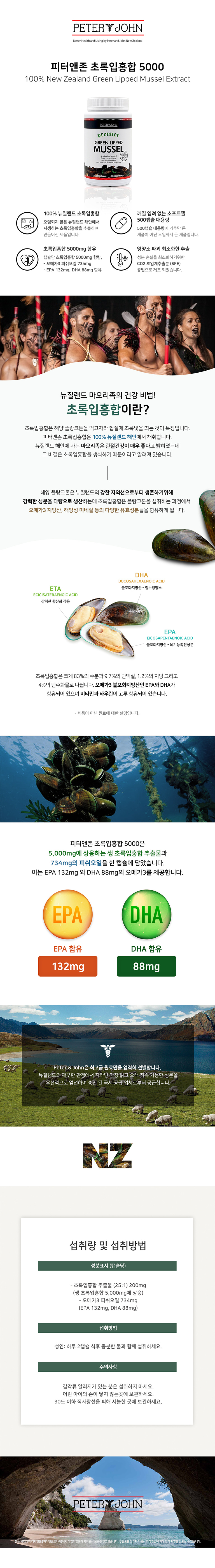 엄선된 뉴질랜드 초록입홍합 캡슐당 5000mg 함유 초록입홍합 오일 + 오메가3 피쉬오일! EPA 132mg + DHA 88mg 함유 부드럽고 흡수가 잘되는 소프트젤 캡슐 피터앤존 초록입홍합 5000 Green Lipped Mussel 5000 500softgel capsules 뉴질랜드 마오리족의 건강 비법! 초록입홍합이란? 초록입홍합은 해양 플랑크톤을 먹고 자라 껍질에 초록빛을 띄는 것이 특징힙니다. 피터앤존 초록입홍합은 100% 뉴질랜드 해안에서 채취합니다. 뉴질랜드 해안에 사는 마오리족은 관절건강이 매우 좋다고 밝혀졌는데 그
