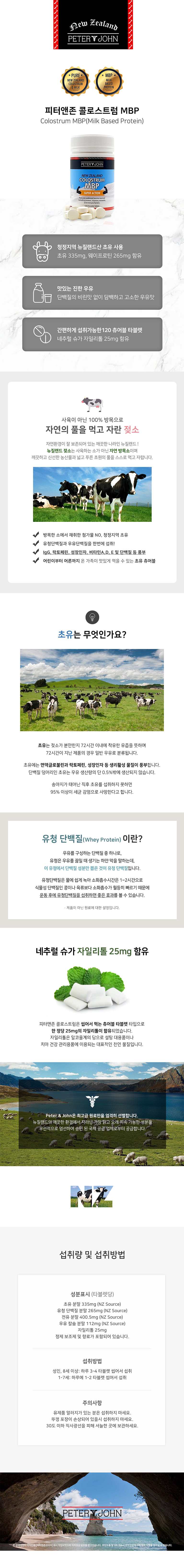 청정지역 뉴질랜드에서 생산! 유청단백질과 우유단백질을 한번에 섭취! 초유 335mg, 웨이프로틴 265mg 함유 피터앤존 콜로스트럼 MBP Colotrum MBP 120tablets 100% 청정지역 뉴질랜드에서 제작합니다. 초유는 젖소가 분만한지 72시간 이내에 착유한 유즙을 뜻하며 72시간이 지난 제품의 경우 일반 우유로 분류됩니다. 초유에는 면역글로불린과 락토페린, 성장인자 등 생리활성 물질이 풍부합니다. 단백질 덩어리인 초유는 우유 생산량의 단 0.5% 밖에